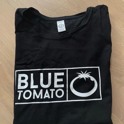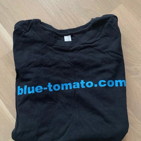 Musta Blue Tomaton t-paita koossa M. Tiukka malli.