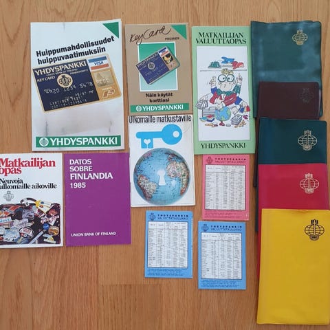 Myydään SYP Suomen Yhdyspankin keräily tavaraa, mm. 5 raha / passi / asiakirjojen koteloa, matkailijan oppaita, valuuttataulukkoja.