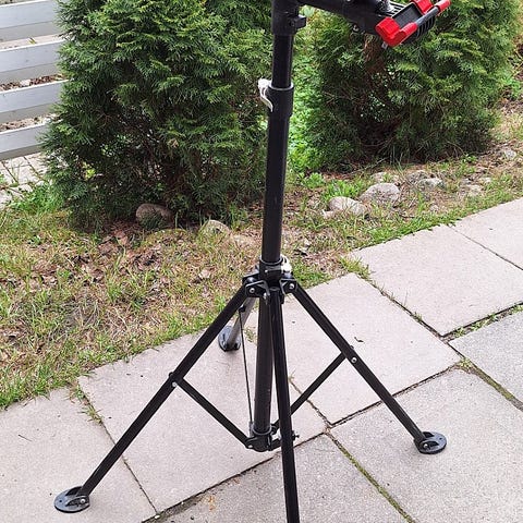 Näppärä Thulen pyäränkuljetusteline kahdelle pyörälle. Yksi kiinnitysvaijereista jumittaa.