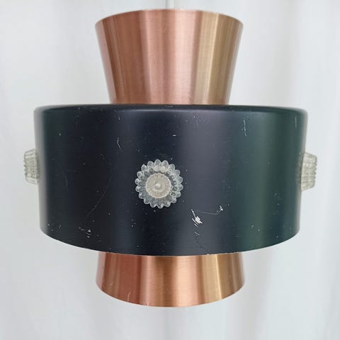Harvinainen Aito 70 luvun kuparivalaisin. suunnittelija oli joku aikansa kuuluisuus