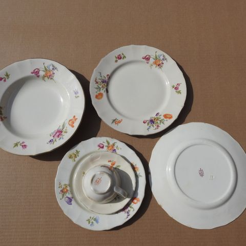 Kuvan mukainen setti, keittokulhon kannessa kuvan mukainen lohkeama