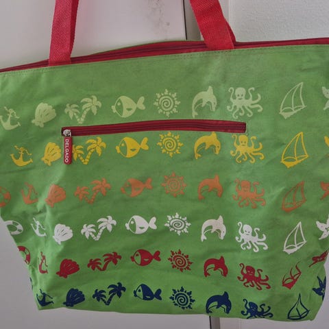 Kuvan mukainen vihreä rantakassi isolla vetoketjulla, sisällä pieni tasku. Kaunis luonnonvalkoinen/vihreä. Kassi 47cm x 31cm. Uusi.