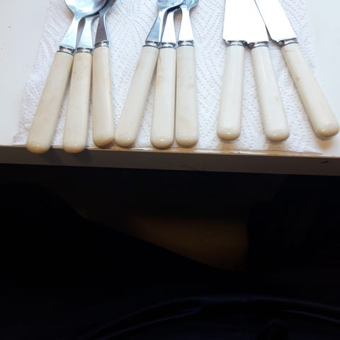 Haarukka ja Veitsi, Haarukan pituus 18cm ja Veitsen pituus 20.3cm, Haarukassa merkintä Prisma NS ja Veitsessä Prisma Nysilver, ehjä(tummentumaa).