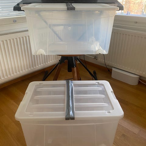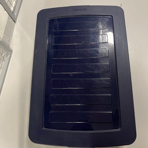 Siisti sisältä ja ulkoa. Sisäpuolen kulmissa pohjalla näkyy tummaa kiinnitysliimaa joka vain kuultaa läpi.