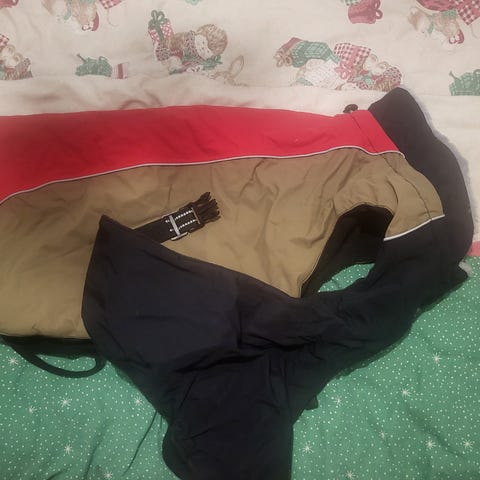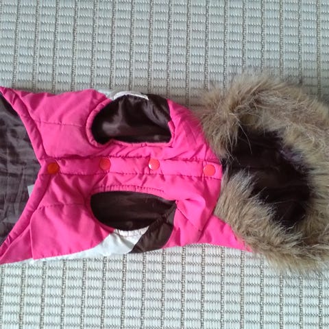 Koiran toppatakki . Meillä ollut sileäkarvainen collie, joten koko on sopiva keskikokoiselle koiralle sekä siitä pienemmälle. Ollut muutaman kerran käytössä. Takin kunto on uutta vastaava.