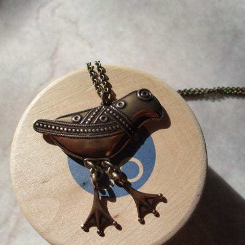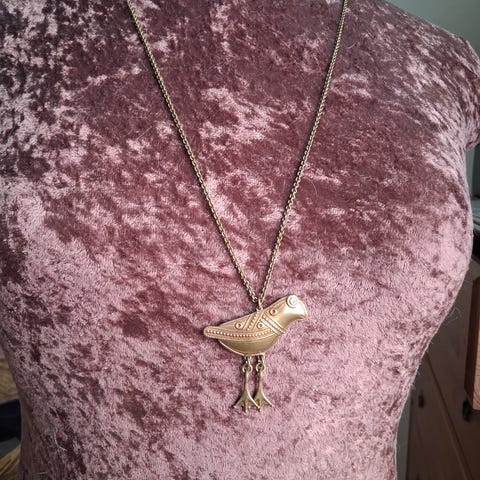 Pronssinen Kalevala korun Hattulan lintu riipus ja ketju. Hyvässä kunnossaa vähänkäytetty, mutta ehkä hivenen tummunut. Lintu pyrstöstä nokkaan 34 mm ja ketju 60 cm. Rasia ei ole tallessa.