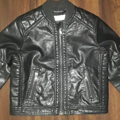 Söpö biker-tyylinen musta keinonahkatakki koossa 86. Myynnissä myös takkiin sopivat bootsit.