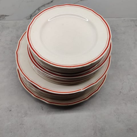 Arabian Lotta-astiasto. Käyttämätön. Ainoastaan kannua on käytetty, jossa käytön jälkiä. Kuuluu 2 kpl soppakulhoja, kastikekulho, 4 tarjoiluvatia. Syvät lautaset sekä matalat lautaset 7 kpl sekä lisäksi 12 kpl erikoista pienempää lautasta (leipälautanen).