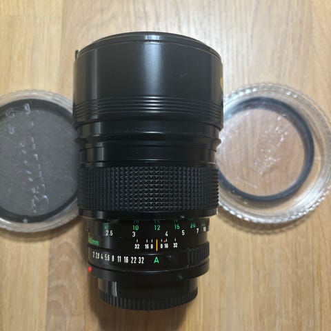 Canonin FDn 100mm potrettilinssi erinomaisessa kunnossa. Linssipinnat naarmuttomat ja tarkennus pyörii pehmeästi. Ulkoisesti myös siistissä kunnossa ilman näkyviä kolhuja tai ruhjeita. Toiminut mm. potrettilinssinä peilittömän digijärkkärin kanssa mainiosti.
