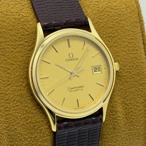 Malli: Omega Seamaster Quartz, 14ct kultainen juhlamalli vuodelta 1976.