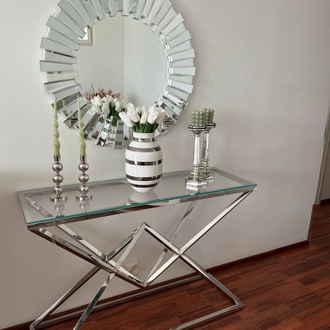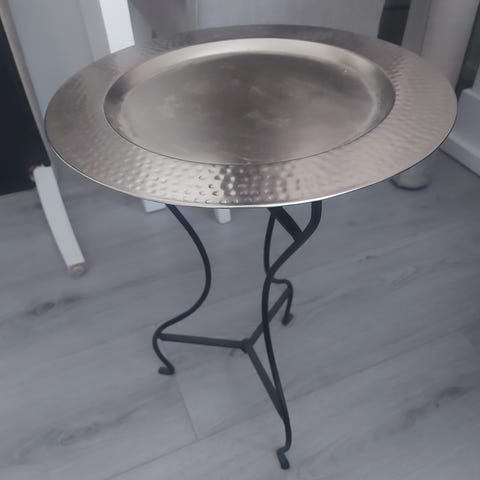 Tarjoilupöytä. Korkeus 57cm, halkaisija 35, materiaali kromi-vaneri.