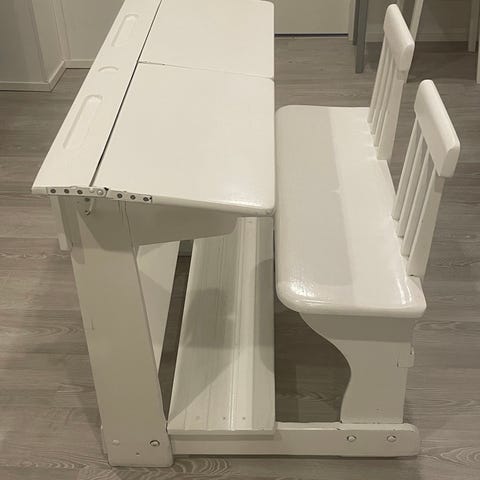 Vanhanajan valkoiseksi maalattu paripulpetti. Siistissä kunnossa, mutta jos priimaa haluaa niin voi itse maalata uudestaan.