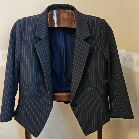 KILLERCAT, käyttämätön liituraitajakku jossa kirjekuorimalliset sivu-ja rintataskut. Nappi kiinnitys. Size inseam L mutta vastaa paremmin M-kokoa.
