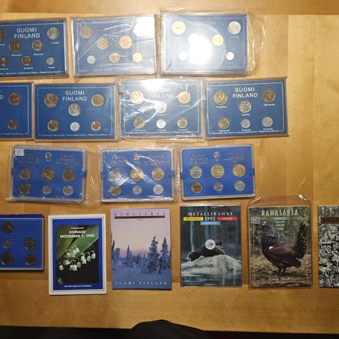 Myynnissä kuvassa olevat Suomi markka-ajan rahasarjat vuodet 1993 x1,1993/2 x2,1999/1 x1,1999/2 x2 ja 2000/1 x1.Kaikki kotelot ehjiä,kolikoita ei ole otettu niistä pois. Siistiti kotelot.Mieluiten myyn kaikki kerralla.Hinta 10,00 per sarja.Kuvassa olevat 1973 rahasarjat MYYTY