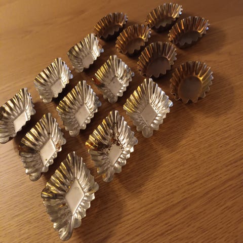 Isoja pyöreitä leivosvuokia 12kpl, halk. 7,5cm, Bebe vuokia 12kpl, halk. 6cm, sydän muotit 12kpl, pituus 7,5cm, lehtimuotti 6kpl,pit 10cm ja vinoneliö 6kpl, 10x6cm. Ainoastaan sydän vuuat on myymättä 1,60e/kpl.
