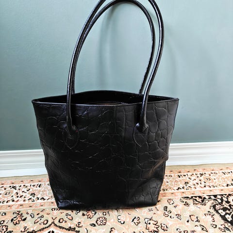 Musta, siisti nahkainen käsilaukku koristetikkauksin. Sisällä kangasvuori, toisella puolella kaksi pientä avointa taskua ja toisella yksi iso vetoketjullinen tasku. Laukussa on rinkulat pitempää olkahihnaa varten, mutta hihnaa ei enää löydy. Tunnettu laadukas Pigeon-laukku, Suomessa valmistettu.