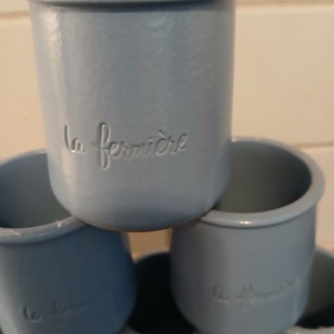 Hartaudella vuosien aikana kerätyt eri väriset keraamiset La Fermière -jogurttiruukut / kipot.