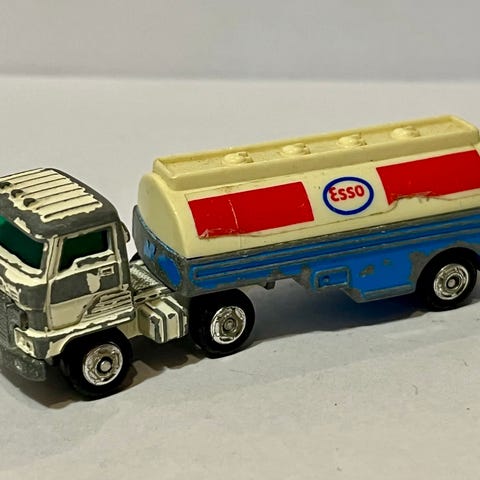 Ulkoleikeissä ollut tankkiauto (gasoline truck) on haalistunut ja akselisto on kärsinyt pyörineen. Se on valmistettu kaukana Hong Kongissa. Pituutta vanhuksella on 9,7cm ja leveyttä 3,2cm. Puuttuuko muoviautokokoelmastasi juuri tämä malli? Myynnissäni on muitakin autoja. Selailepas monenlaisia Tori-ilmoituksiani (mm. vintagea, keräilytavaraa, nukkeja, figuureita, merkkejä, astioita, jalkineita, vaatteita, metallitavaraa), saatat löytää tilattavaa samassa paketissa toimitettavaksi postikuluja kohtuullistaen.