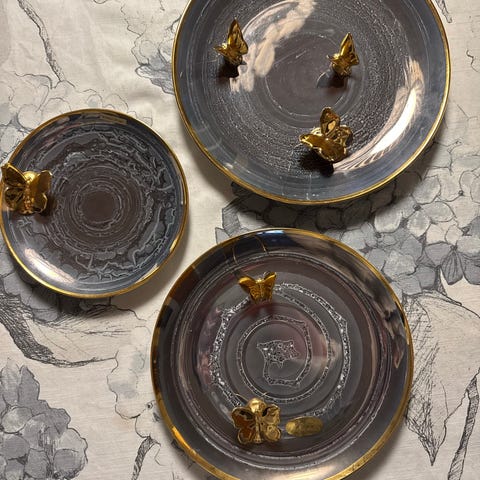 Leena Heinosen upea Natura seinälautanen. Käsinmaalattu, perhoset kullattu muistaakseni 14kr kullalla.