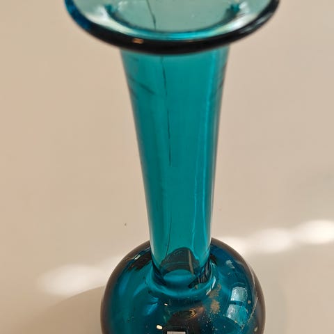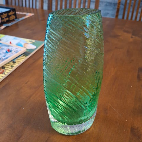 Vihreä lasinen maljakko. Muodoltaan orgaaninen ja aaltoileva, sopii kukka-asetelmille tai sisustuselementiksi. Materiaalina värillinen lasi.Tarjoa!