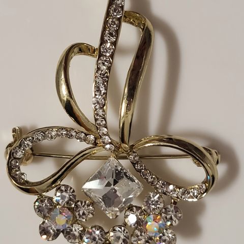 Myydään kaunis strassi rintakoru. Koru on muuten hyvässä kunnossa, mutta yksi kivi on irronnut. Näkyy kuvassa.