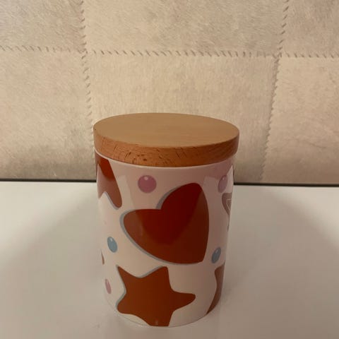 sesonkituote 2007, korkeus puukannen kanssa 13,5cm, suuaukon halkaisija ulkomitta 10cm, paino kannen kanssa 645g, kannen reunassa hyvin vähäistä käytön jälkeä, purkki uudenveroinen.