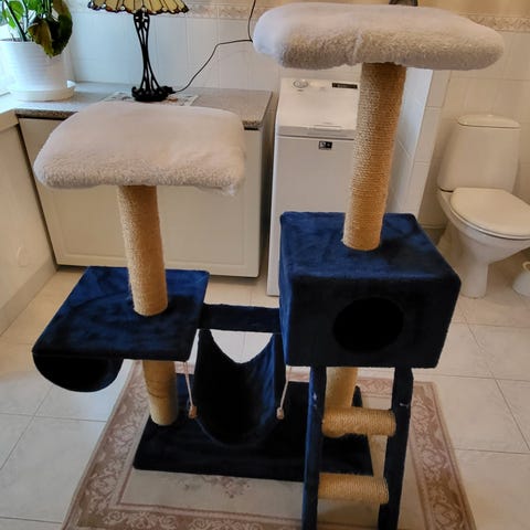 Kevyt rakenne, eli jalustan päälle kannattaa laittaa ehkä jotain painoksi (kissan paino huomioiden).