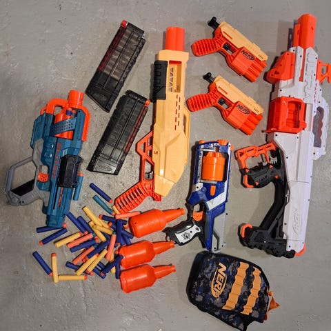 s: leikkiase, leikkipyssy, panos, panokset, patruuna, patruunat, kuti, kudit, luoti, luodit, nerffit, pati, patit, nuoli, nuolet, lasten lelu.