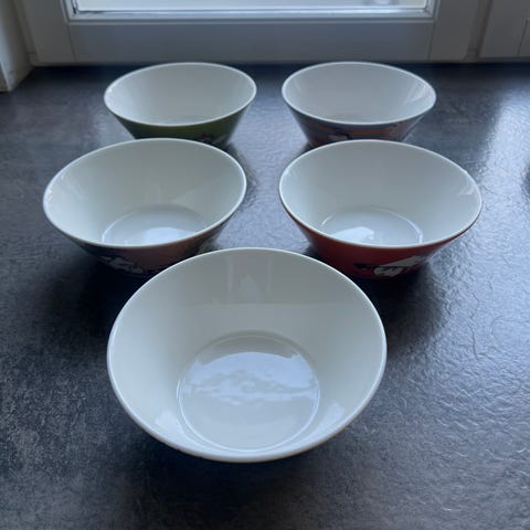 4 erilaista muumikulhoa, olleet hyllyllä.