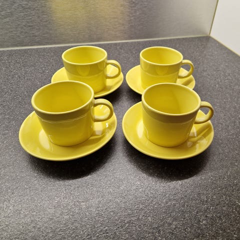 Teema sarjaa, keltaiset kahvikupit lautasineen, 8 paria, kunto hyvä, hinta 110eur.