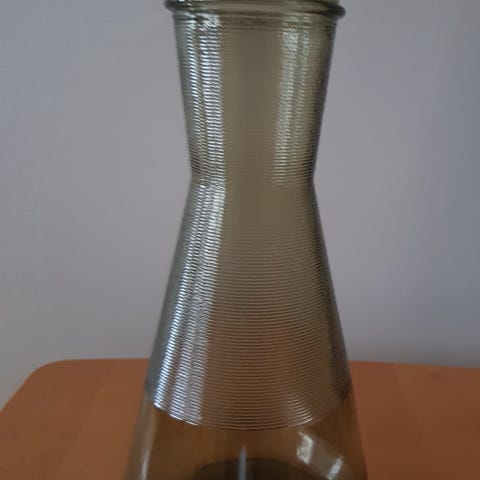 vihertävää lasia, pohjassa näkyy himmeästi "Karhula", halkaisija yläosa 6cm, reunan korkeus 9,3cm, pohja hiottu, ulkopohjassa hankaumajälkeä pöydällä siirtelystä, lasissa pientä naarmuisuutta, ehjä, hyvä vintage kunto