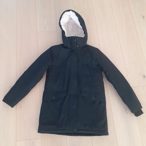 Myydään tummansininen ja lämmin talvitakki, koko 160 cm, vetoketjukiinnitys ja tarrat, taskuja 5 kpl, vyötäröllä kiristysnyörit, hihansuissa resorit. Vettähylkivä päälykangas ja lämmin vuorikangas.