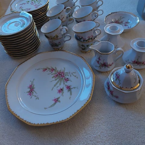 Kahvi/teeastiasto, josta kuitenkin puuttuu kakkulautaset. Kakkuvadin läpimitta 31 cm.