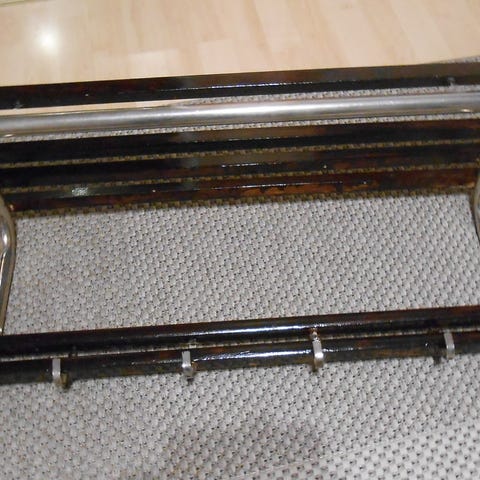 Puinen seinänaulakko messinkisillä koristelevyillä ja koukuilla.