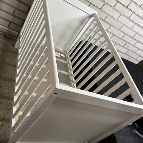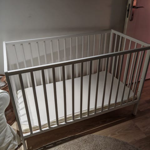 Muutaman yön nukuttu Ikean pinnasänky siistillä patjalla. Mukaan saa myös syöttötuolin ja vauvakeinun kaupan päälle.