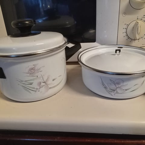 Kattilat päältä erinomaiset. Sisältä tummuneet ja isommassa ruostettakin.