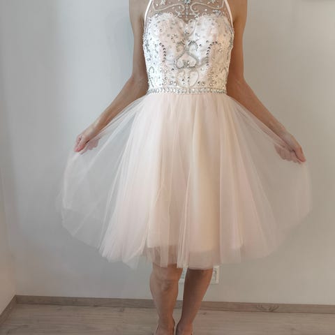 Myydään kaunis, strassi koristeinen pari kertaa käytössä ollut juhlamekko. Väri valkoinen. Helma on kaunista tyllin tapaista materiaalia. Koko: 36/S. Hinta 100 euroa/tarjous!