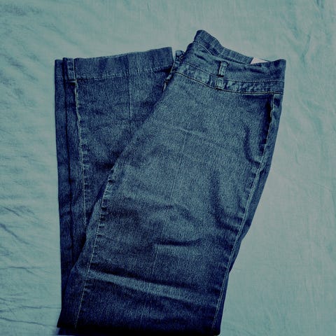 Vyötärö noin 39-40cm leveä ja lahkeen sisäpituus n. 77cm