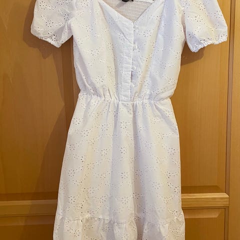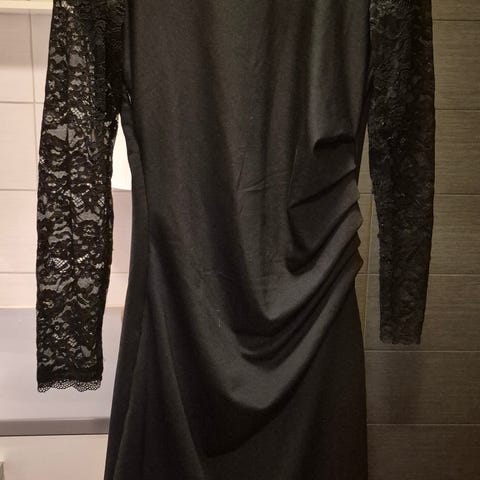 Pitsihihat ja irroitettava vyö (solmitaan taakse). Merkitty koko XL mutta vastaa paremmin kokoa L. 80% polyesteri, 20% puuvilla. Mekon pituus 91 cm, rinnanympärys 95 cm, vyötärö 79 cm, lantio 98 cm.