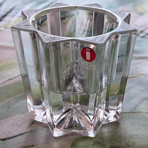 Kuvassa oikealla puolella oleva Markku Salon suunnittelema tuikku. Hinta 6 euroa. Myynnissä myös tuo vasemmanpuoleinen tuikku Tapio Wirkkalan Stellaria, Iittala.