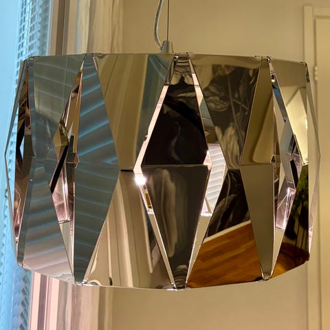 Kaksi kaunista perinteistä kattovalaisinta. Runko messinginvärinen, viisi lasista kuuppaa, joissa herkät myrna-kuviota muistuttavat kukkasomisteet. Tunnelmallinen valo. Toisessa osa lasikupeista vaatii uudelleenkiinnityksen, (pysyvät toki kyllä paikallaan, mutta ovat irtonaiset).