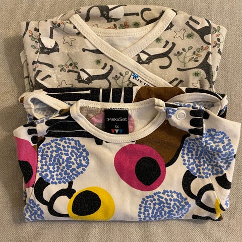 Tutta puuvillabody, 56. Olkapäällä nepparit, joten helppo pukea. Juuri pesty miedolla pesuaineella, ehjä ja tahraton. 100% paksumpaa puuvillaa. Käännettävät hihansuut, joten ei tarvita erillisiä tumppuja raapimisen estoon / vaunuiluun.