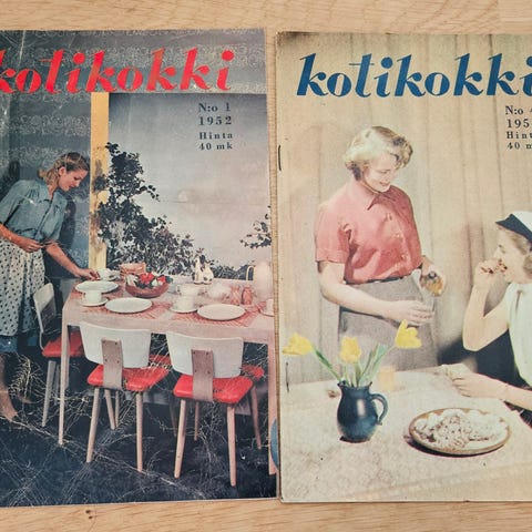Nostalgisia KOTIKOKKI-ruokalehtiä yhdessä tai erikseen. Otava: 1957 ja 1958 täydet sarjat (10 kpl). Näissä myös säilytyskannet lehdille. Täysi sarja kansineen à 25.
