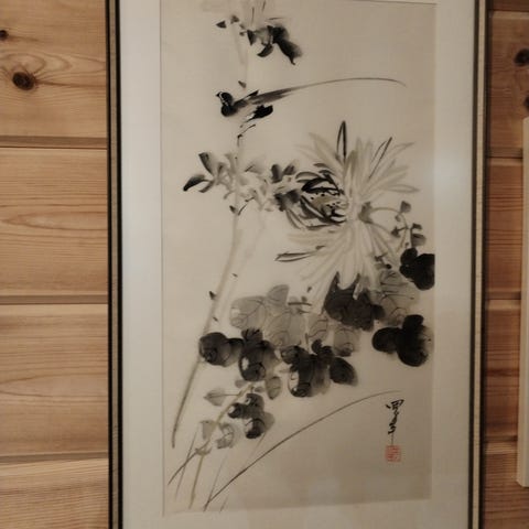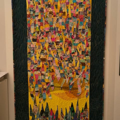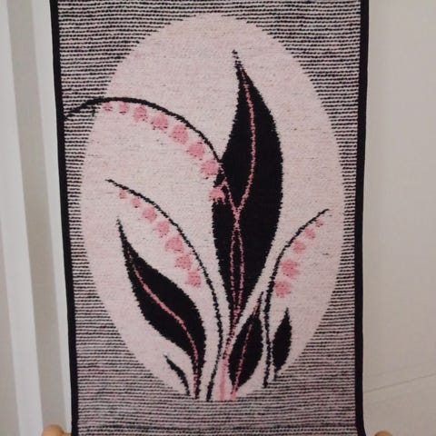 127 cm leveä x 92 cm korkea kokoinen tilkkutyöseinävaate. Väreinä havunvihreä, vedenvihreä, valkoinen ja musta. Yhdessä kulmassa kiinnitettynä sudenkorento. Sudenkorennon siiven harso on hieman kärsinyt, korjattavissa liimalla tai kevyin ompelein. Taustakangas on lummekuvioinen. Lenkkiripustus kuudella lenkillä. Puhdas ja siisti. Eläimetön ja tupakoimaton talous.