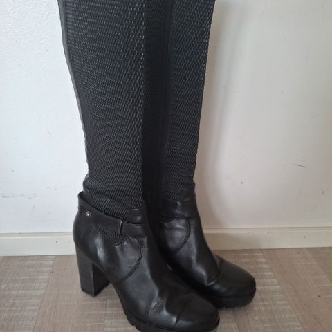 Tamaris-merkkiset mustat nahkasaappaat. Muutaman sentin korko, korkolaput hiljattain vaihdettu ja muutenkin siistit pohjat. Koko 37.