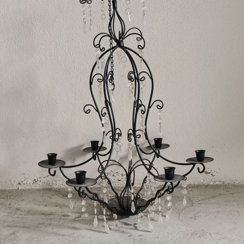 Ripustettava pyöreä (halkaisija 40 cm) kynttelikkö neljälle kynttilälle, valkoinen tai hopeanvärinen. Irrotettava ketju, pituus 50 cm. Voi käyttää sekä kattokruununa että pöytämallina.