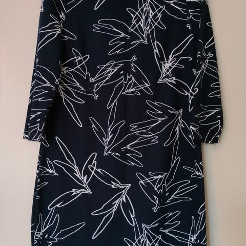 Vilan valkoinen, hihaton mekko jossa mustat raidat. V-kaula-aukko ja vetoketju niskassa.
