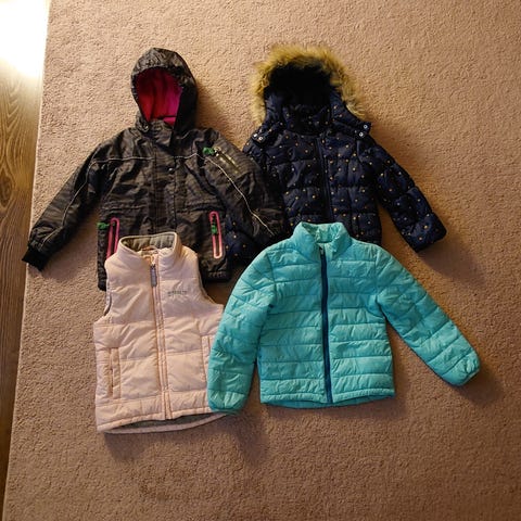 2 tyttöjen toppatakkia koko 11 cm ja 122 cm ja toppapuku 128 cm