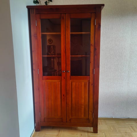 Massiivipuinen kulmavitriini, yläkaapissa lasiovet ja lasihyllyt, alakaapissa yksi hylly.