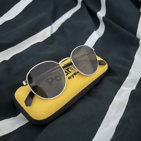 Polaroid aurinkolasit tummanruskealla kehyksellä. Mukana keltainen suojakotelo. Sopii hyvin suojaamaan silmiä auringonpaisteelta ja lisäämään tyyliä asukokonaisuuteen.